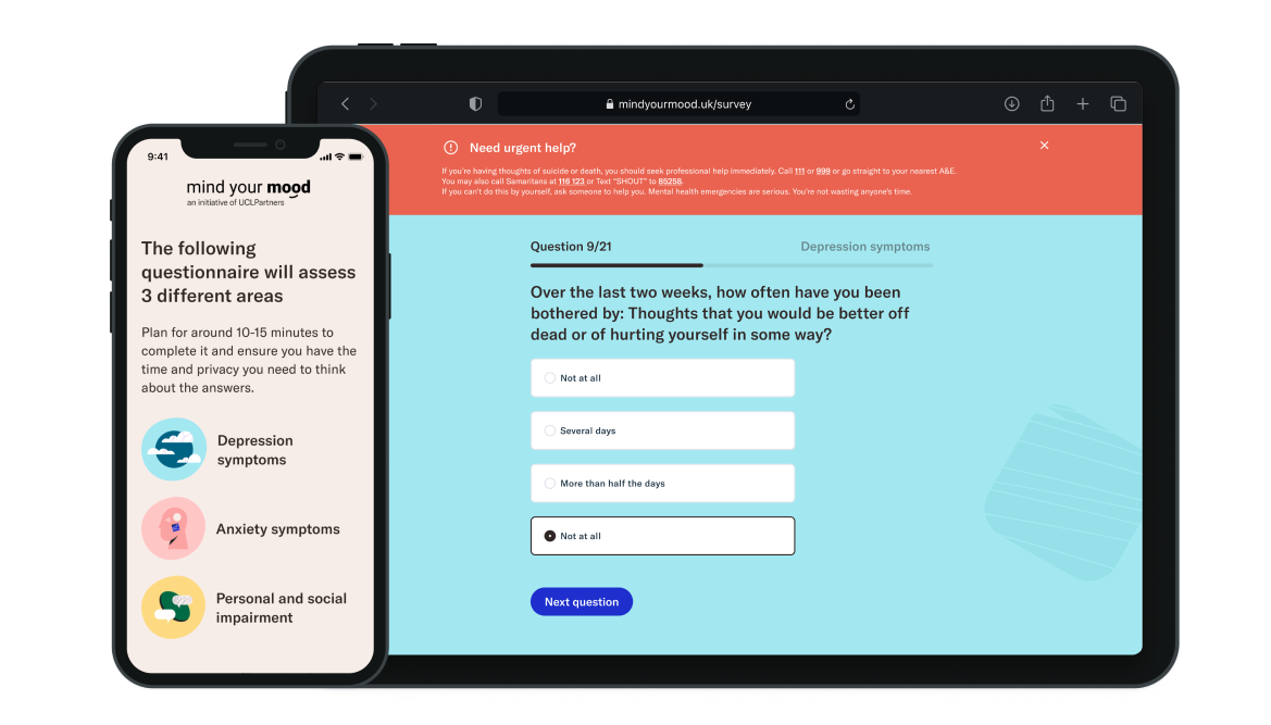 Mind Your Mood was designed in record time (3 months from wireframing to launch). It is a collaboration between UCLP, Koa Health and a steering committee of NHS IAPT coordinators, private GPs in the UK and mental health providers from Doctor Care Anywhere.